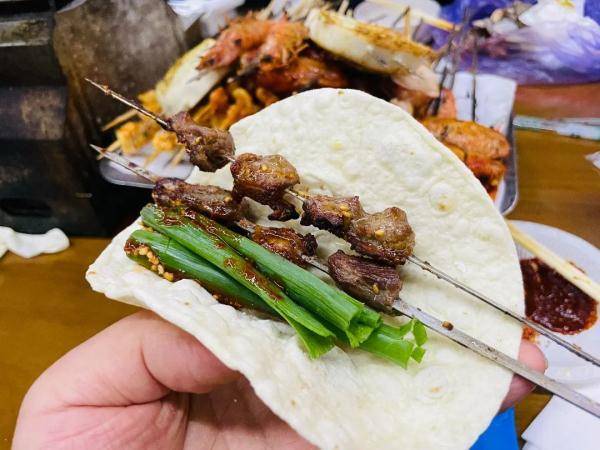 一桌一炉一卷饼,小串小葱小蘸料。食材新鲜,风味独特,分量十足,荤素应有尽有。在食客心中,最在意的还是淄博烧烤的美味与实惠——肉串分1元、1.5元、2元、2.5元、3元不等,小饼每包3至4元,小葱、小酱加蘸料3至5元,人均消费四五十元就能吃饱吃好。