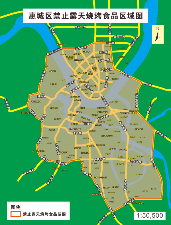 惠州市惠城区禁止露天烧烤食品区域为:北起新寮北路与三环北路交界处,沿三环北路、第三东江大桥、三环西路,西至三环西路与新联路交界处;沿新联路、红花湖路、金榜路、三环南路、下马庄路、演达大道,南至演达大道与四环南路交界处;沿四环南路、惠澳大道、三环东路,东至三环东路与惠州大道交接处辅道;沿惠州大道、东江一号路、人民路、隆生大桥至新寮路,沿新寮路、新寮北路至与三环北路交界处的区域内(详见惠城区禁止露天烧烤食品区域图)。