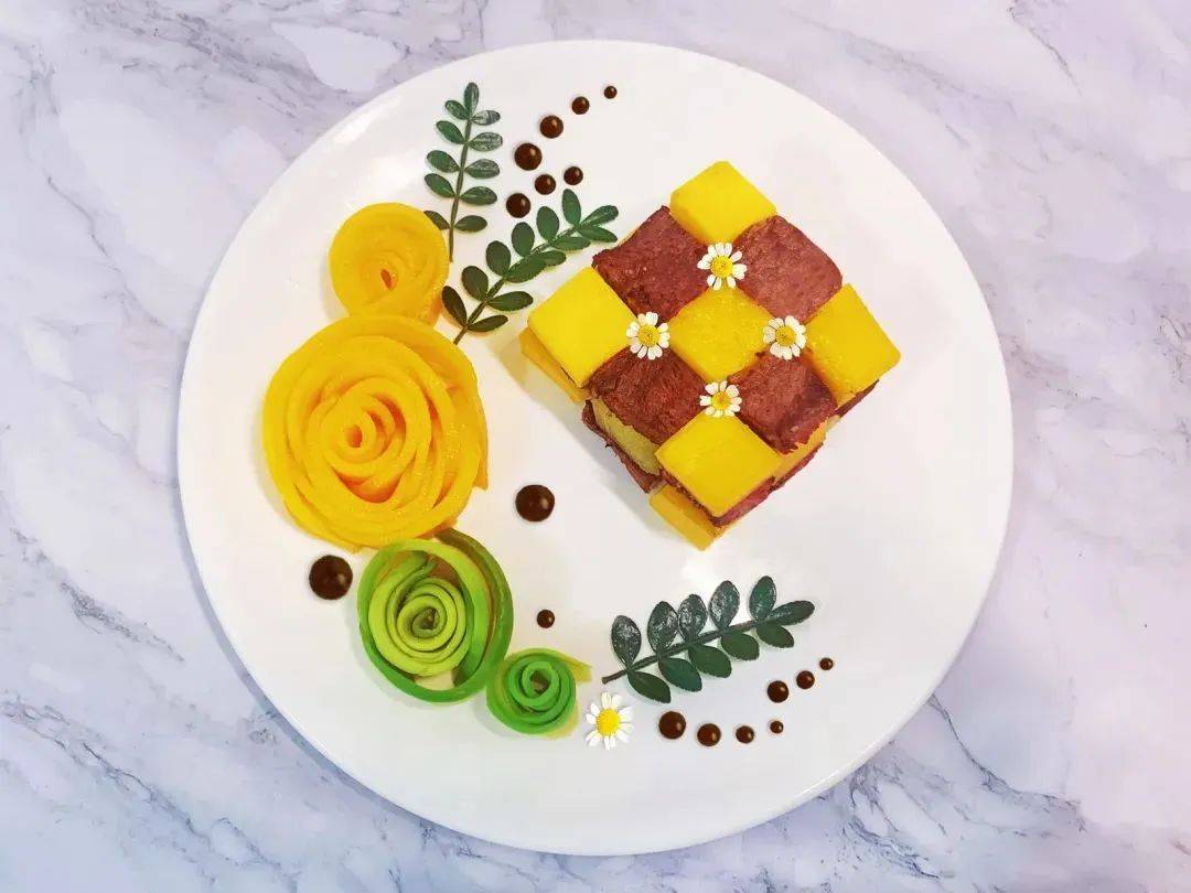 操作并不杂乱:牛排、芒果切成块,摆成魔方大厦~,怎样来制造芒果花朵和牛油果花朵,过程一看就会~